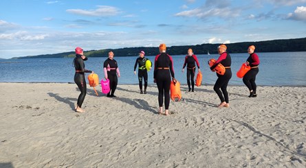 Kig med, når en hel kvindeflok på otte kvinder hoppede i bølgen i Vejle Fjord. Vandet var dejligt, så ruten gik denne mandag aften, ud til Vejle Fjordbroen.