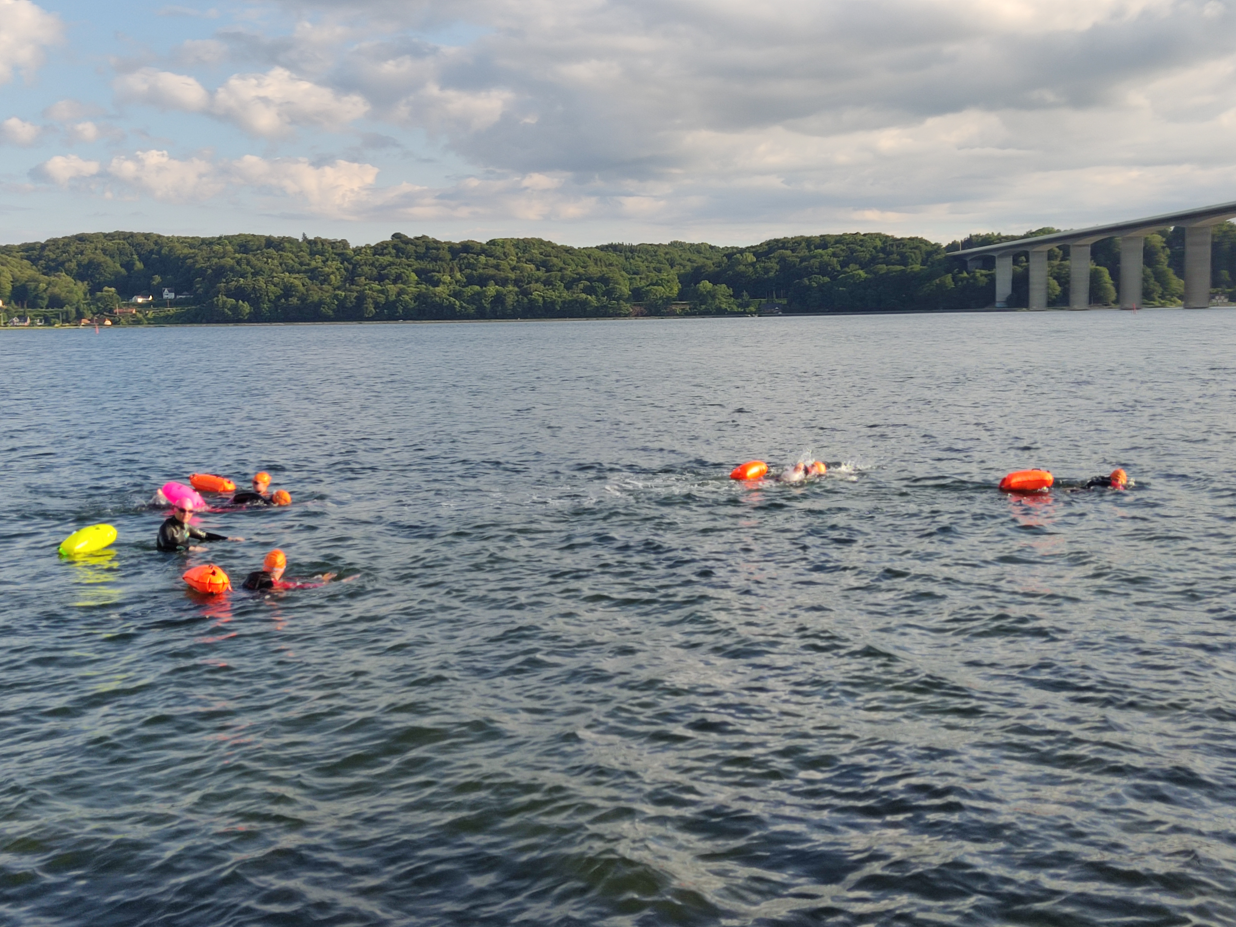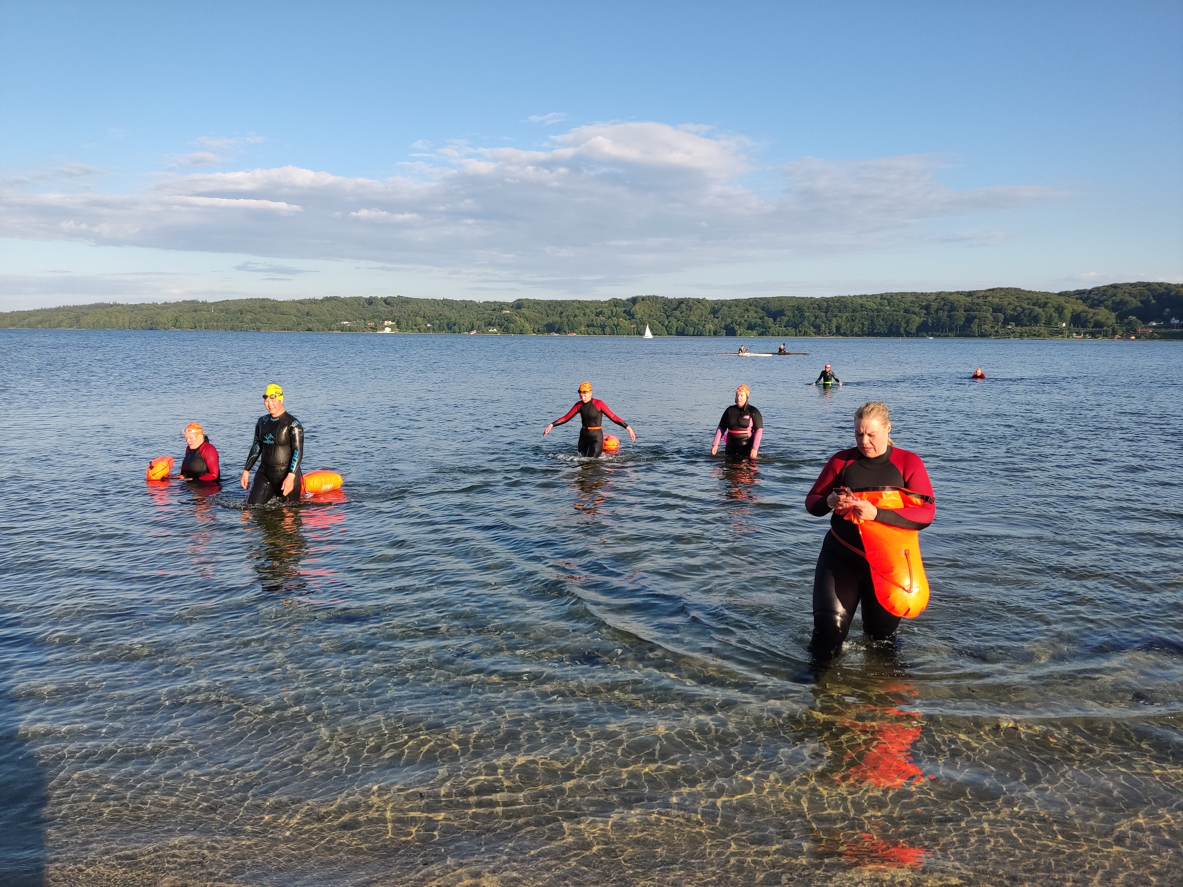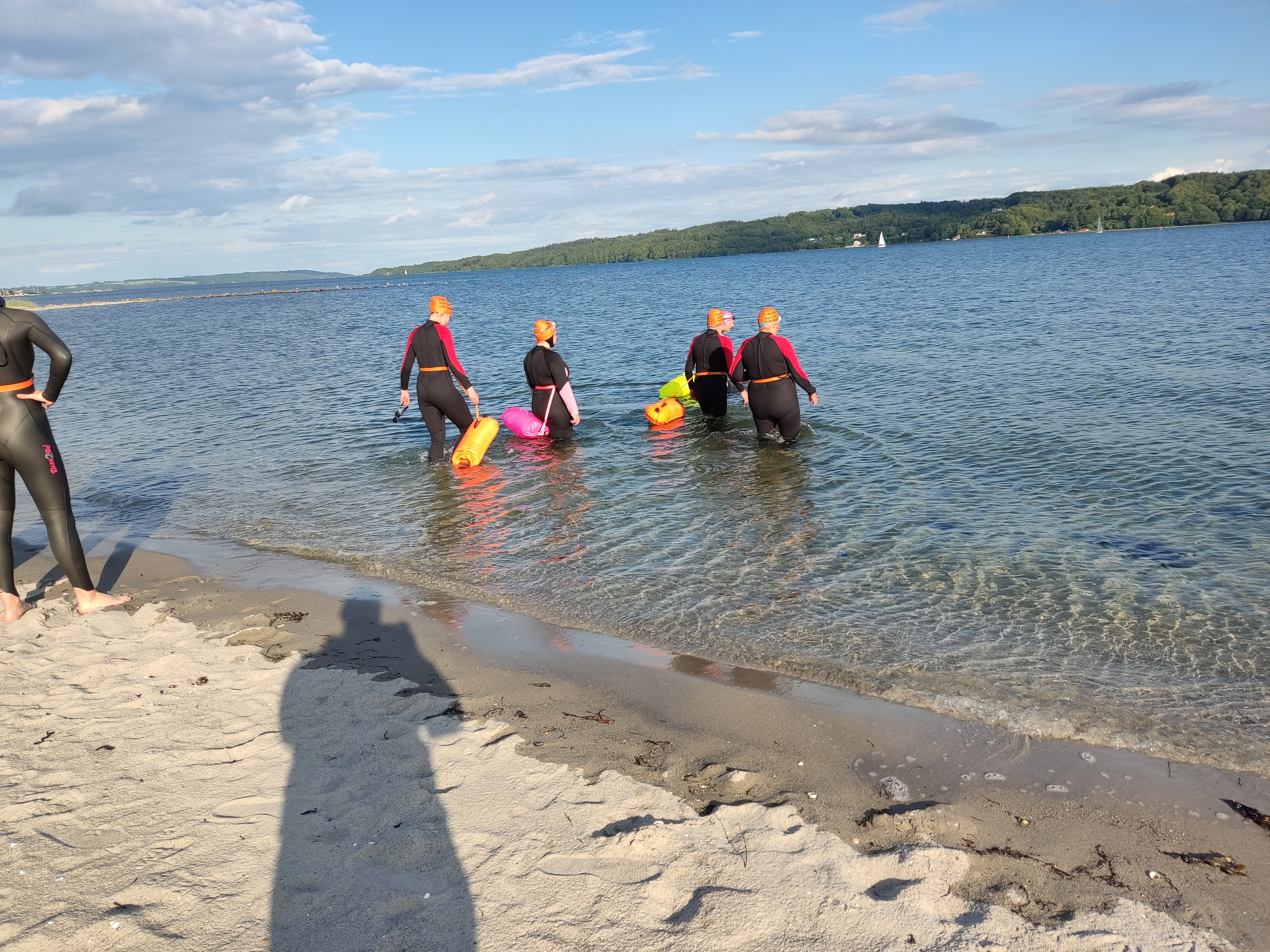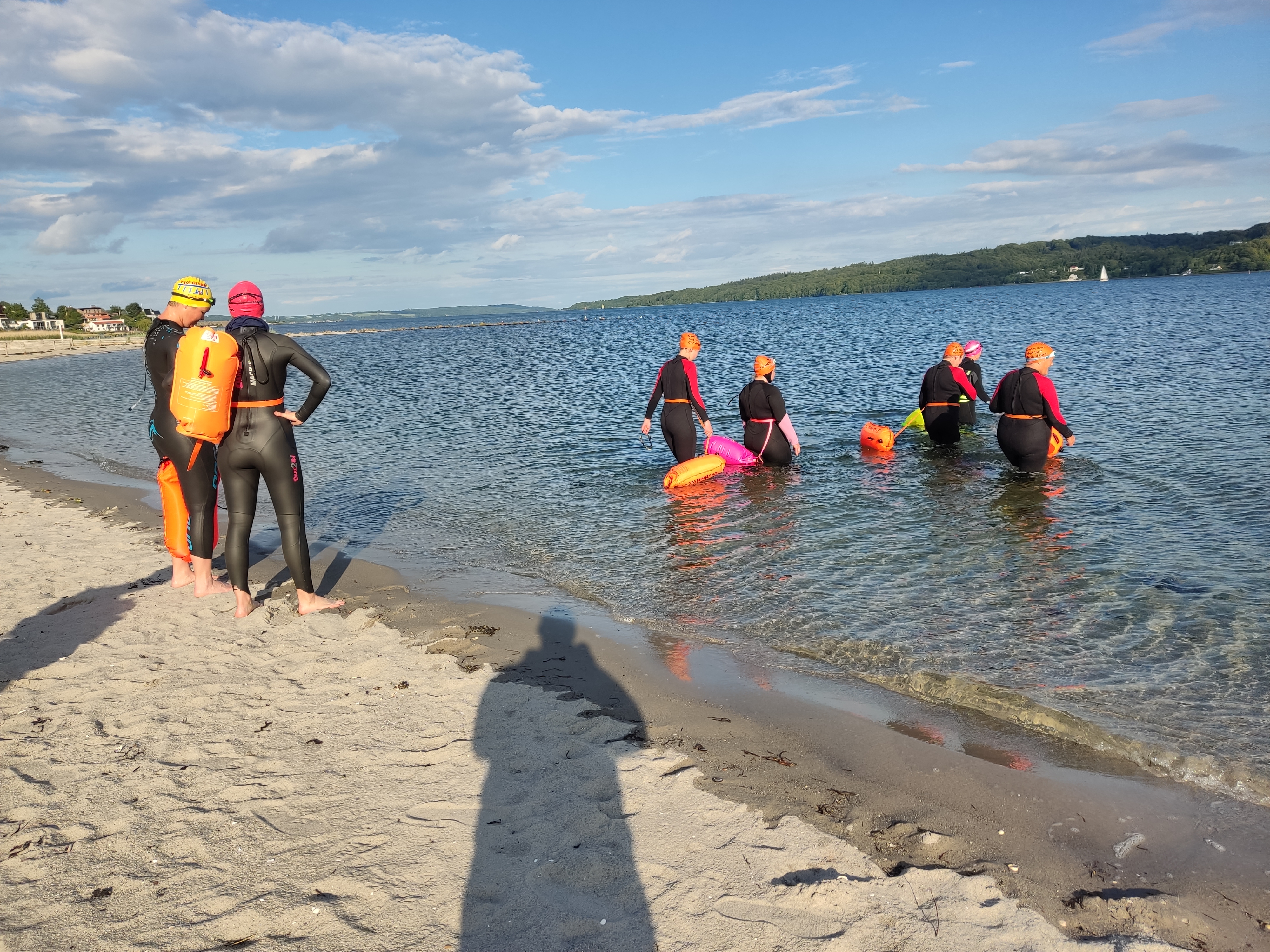 Kig med, når en hel kvindeflok på otte kvinder hoppede i bølgen i Vejle Fjord. Vandet var dejligt, så ruten gik denne mandag aften, ud til Vejle Fjordbroen.