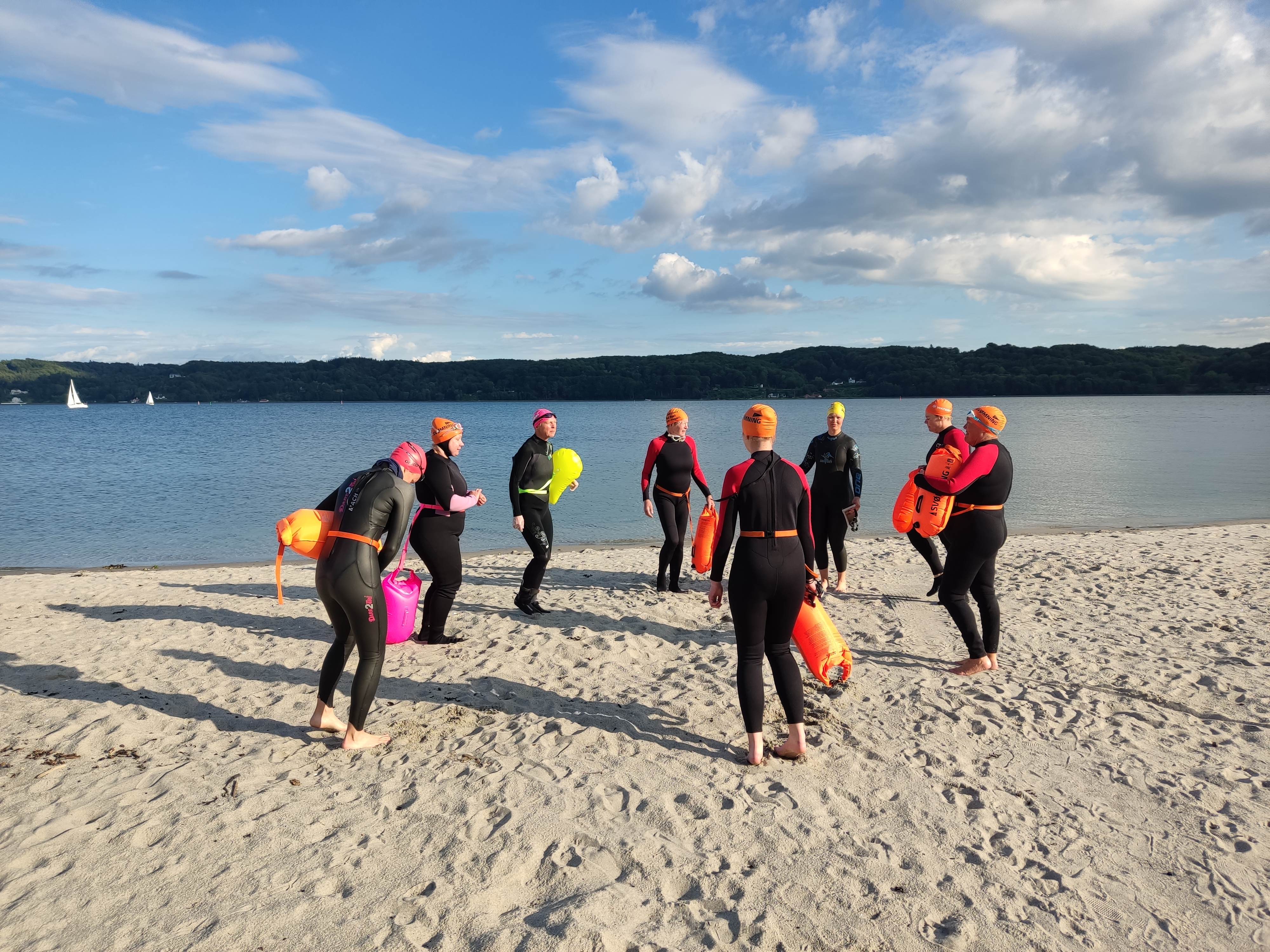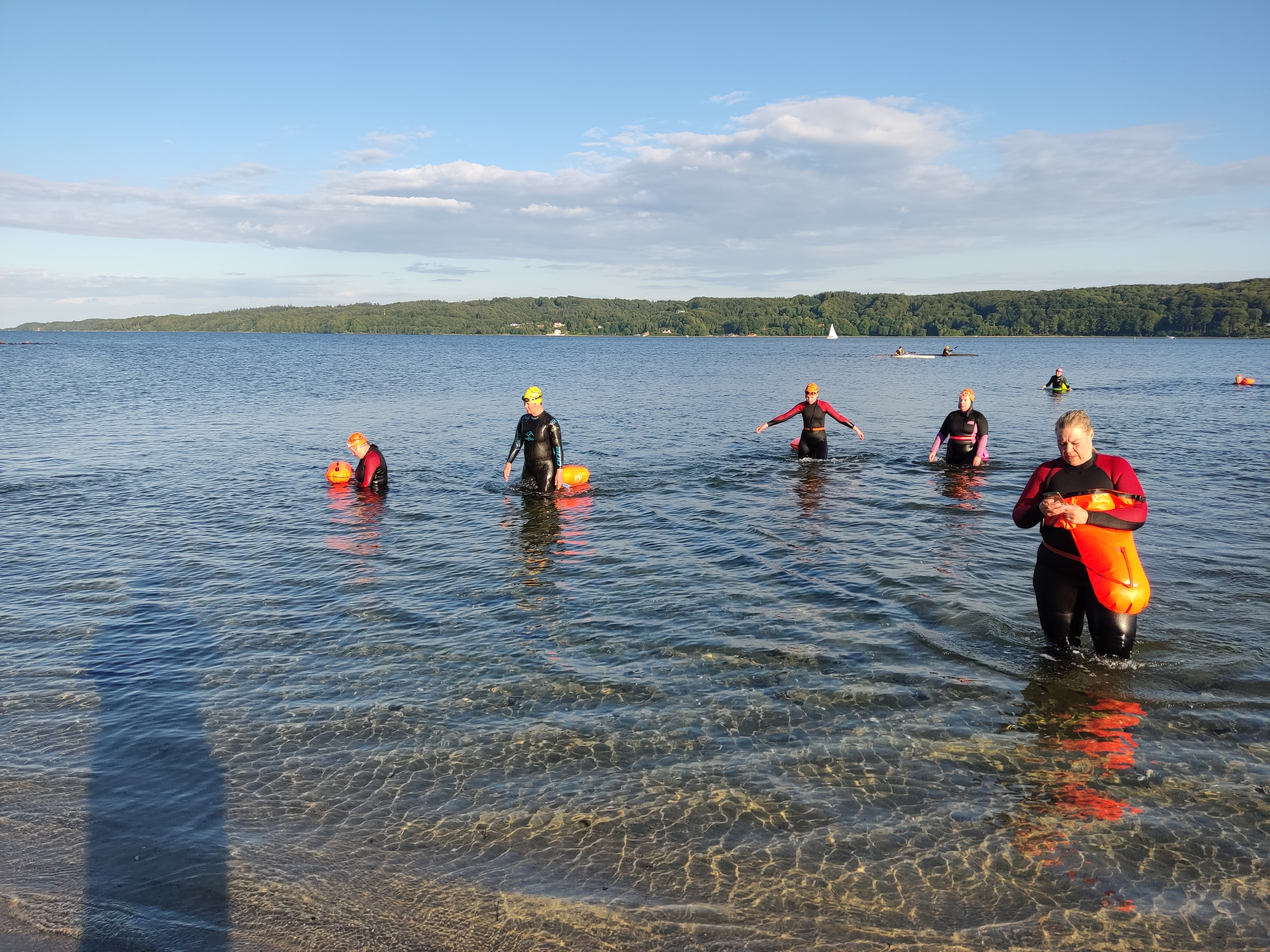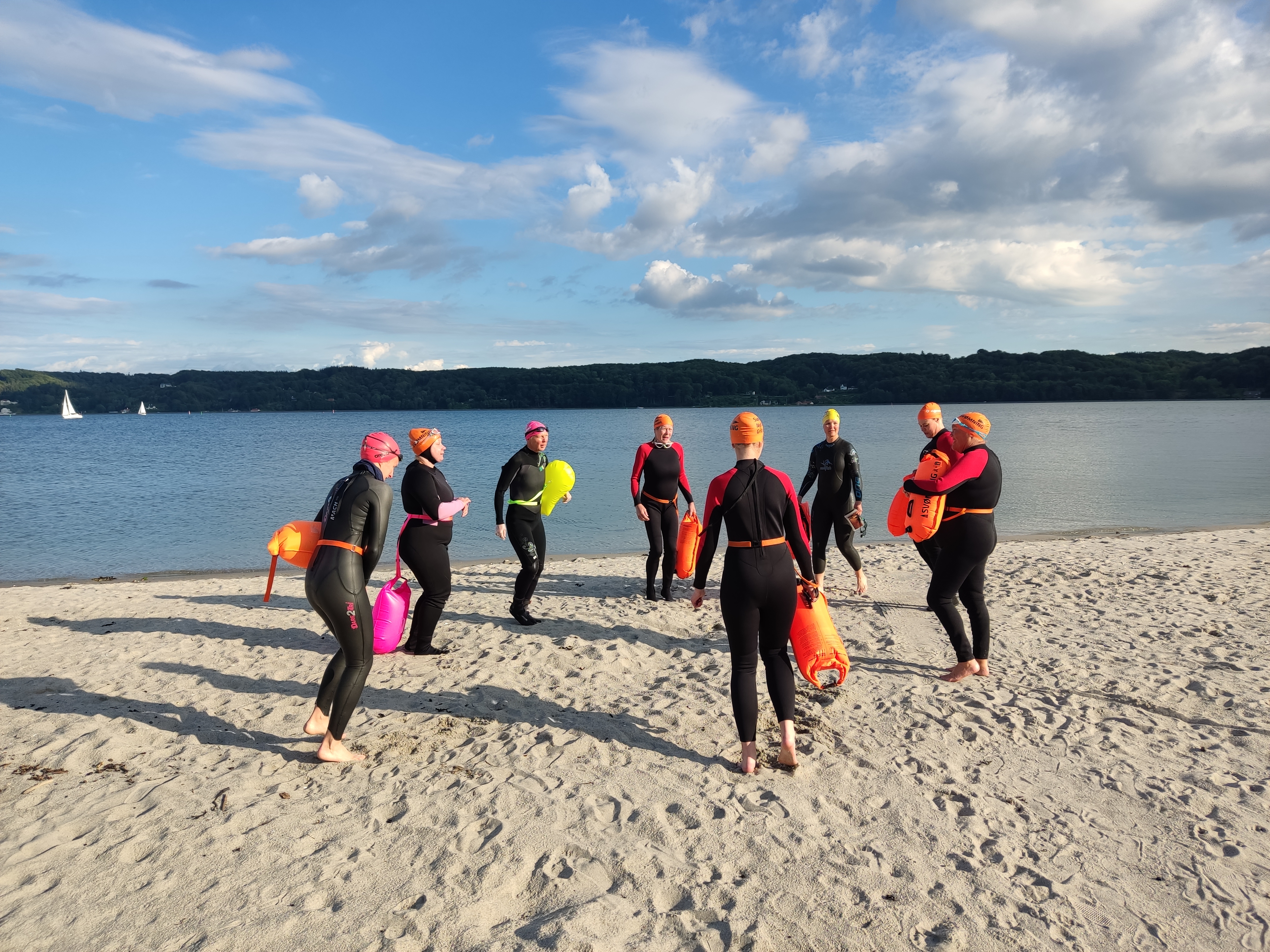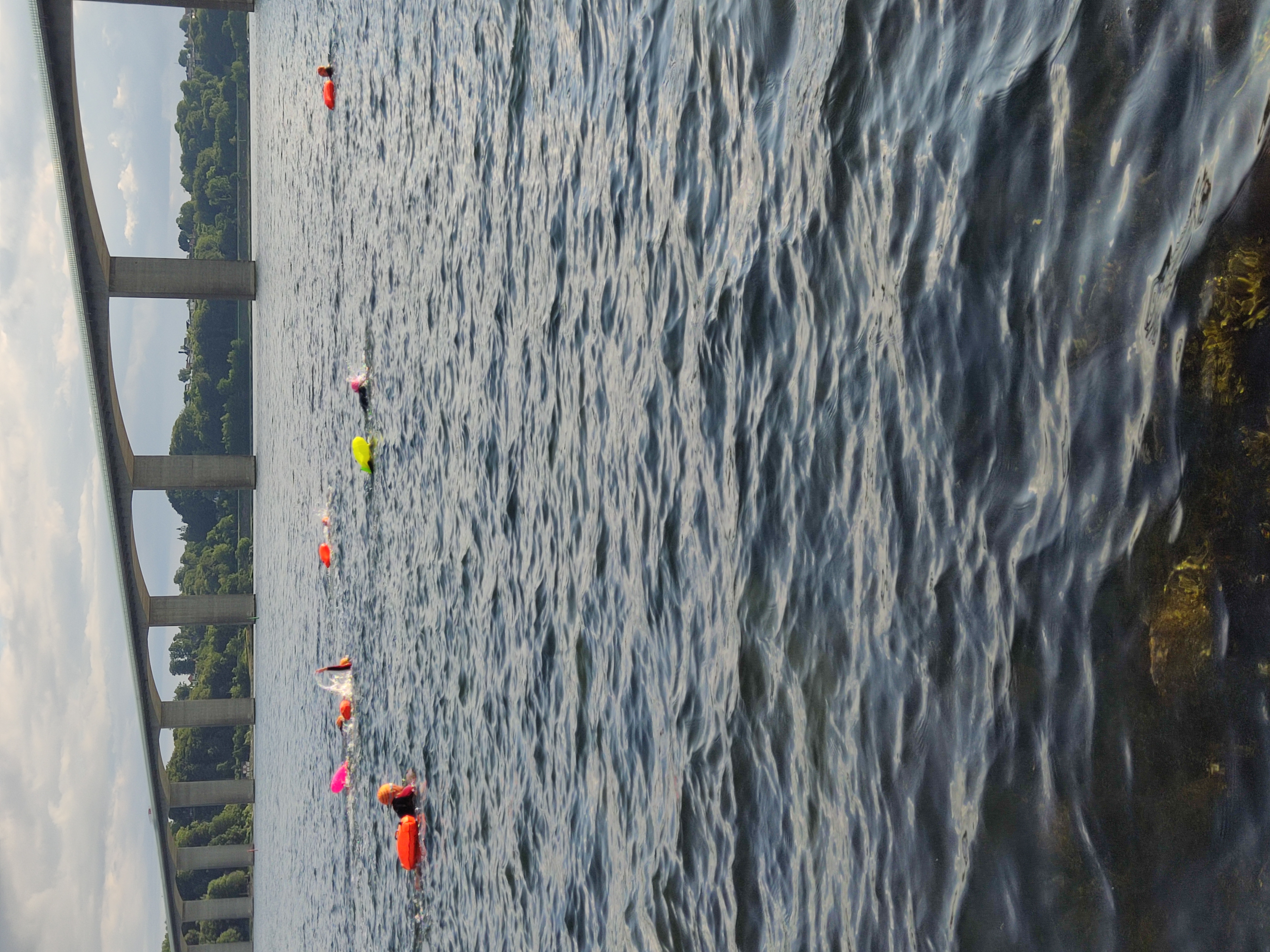 Kig med, når en hel kvindeflok på otte kvinder hoppede i bølgen i Vejle Fjord. Vandet var dejligt, så ruten gik denne mandag aften, ud til Vejle Fjordbroen.
