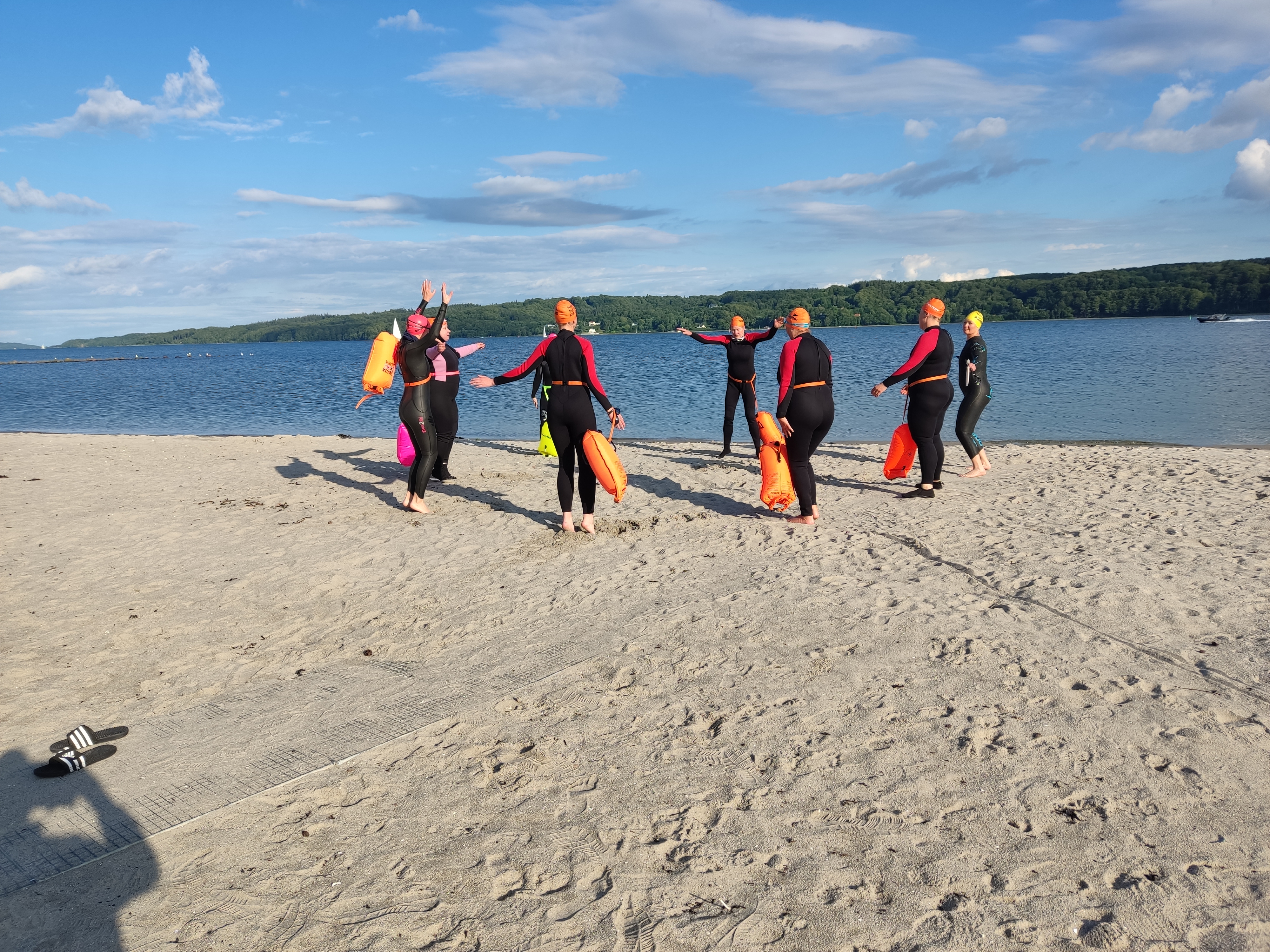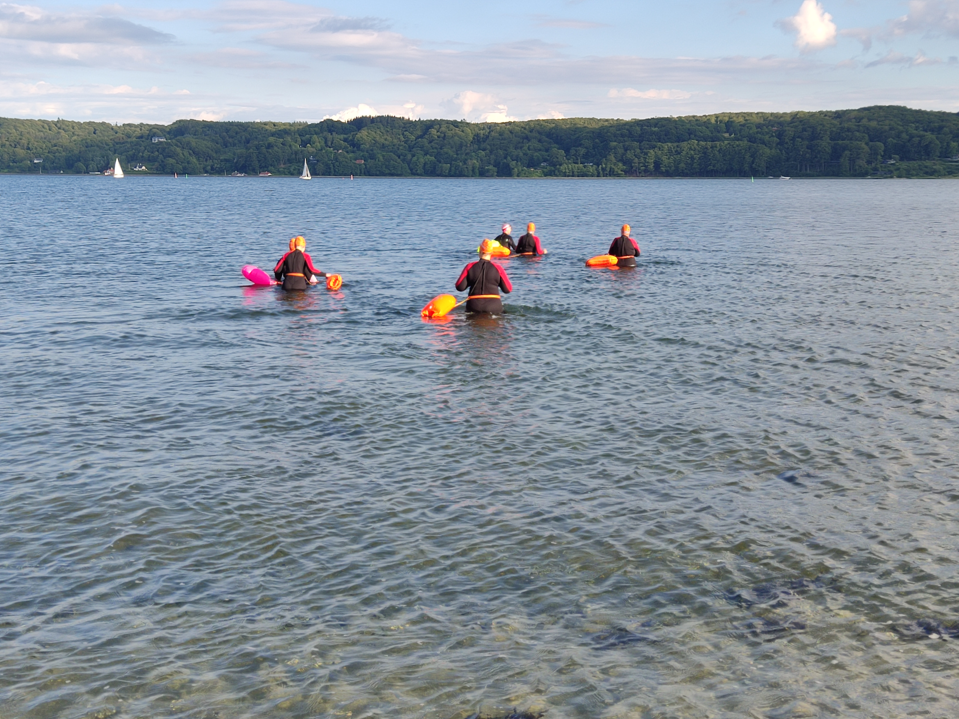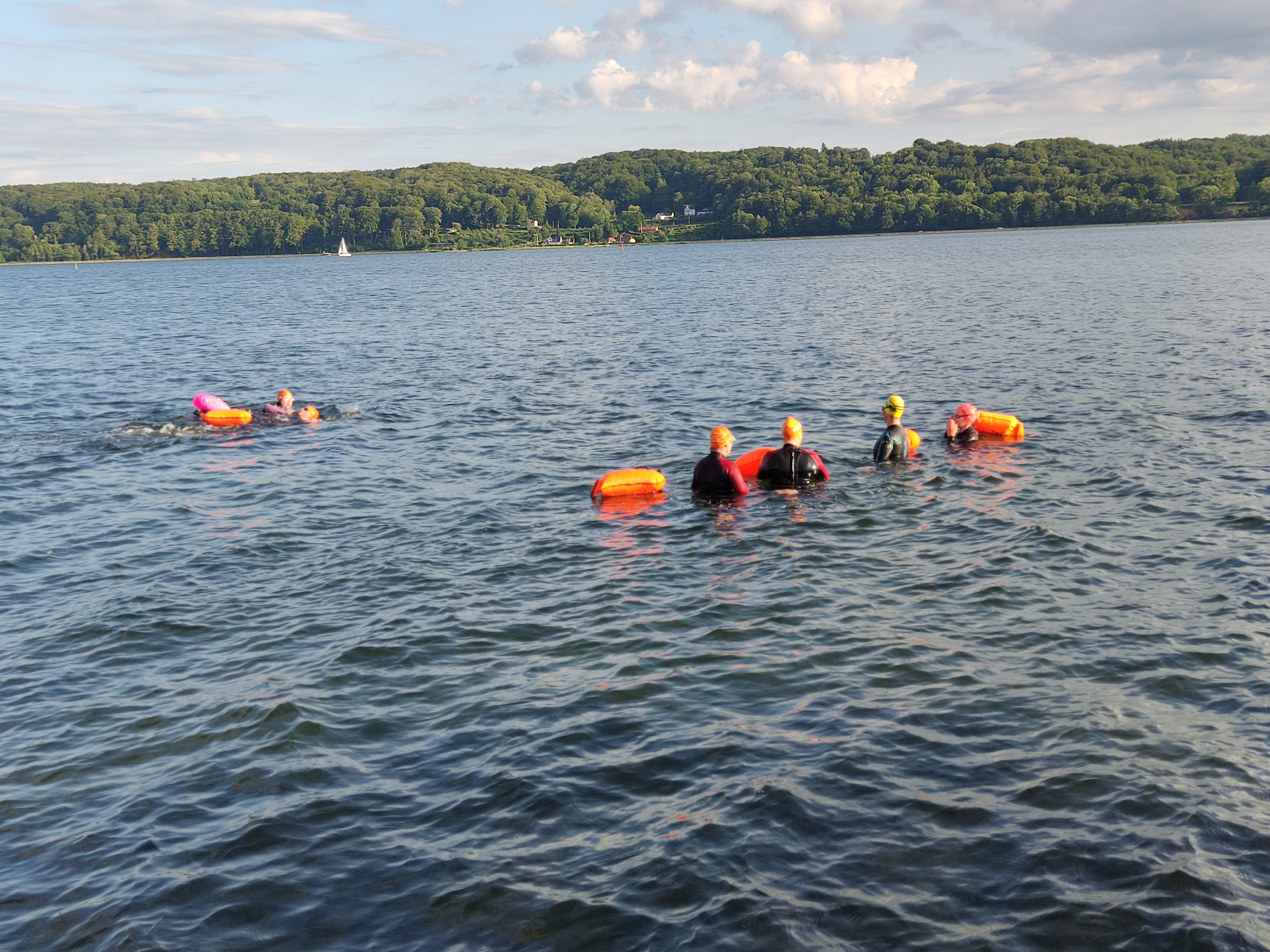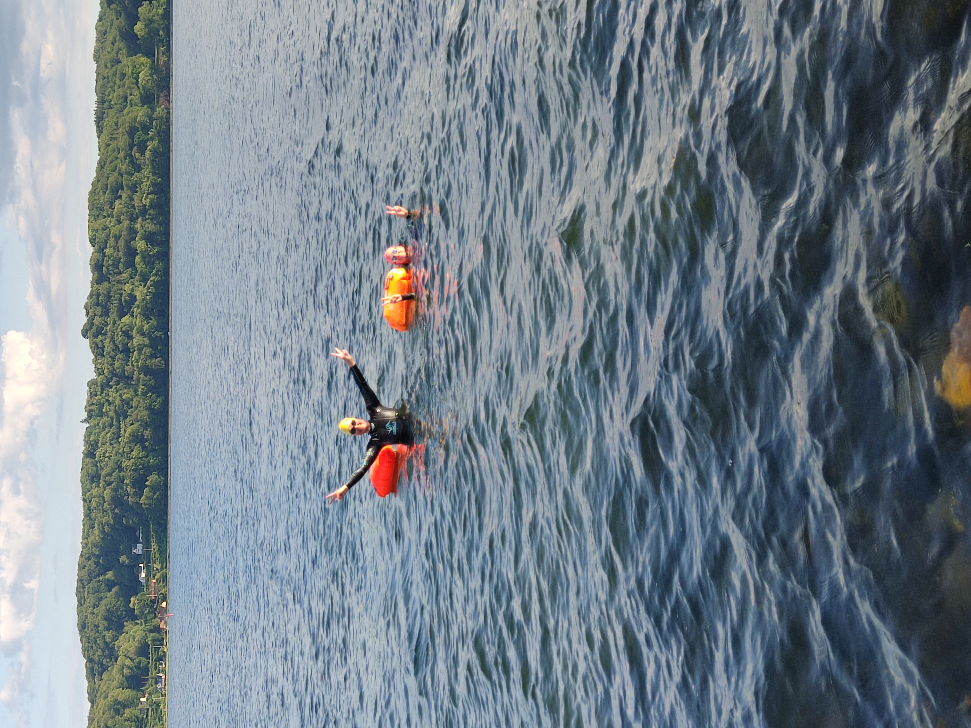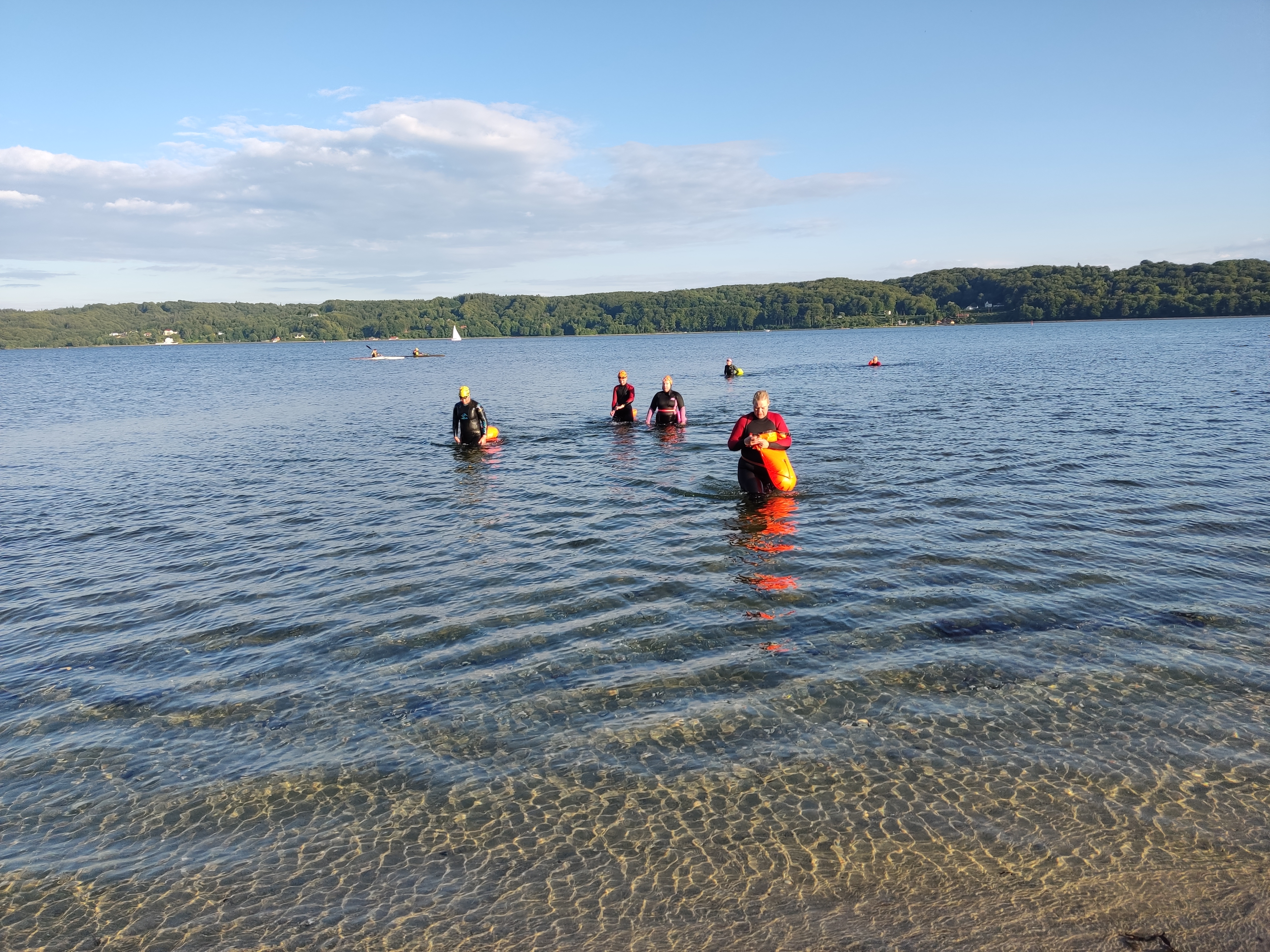 Kig med, når en hel kvindeflok på otte kvinder hoppede i bølgen i Vejle Fjord. Vandet var dejligt, så ruten gik denne mandag aften, ud til Vejle Fjordbroen.