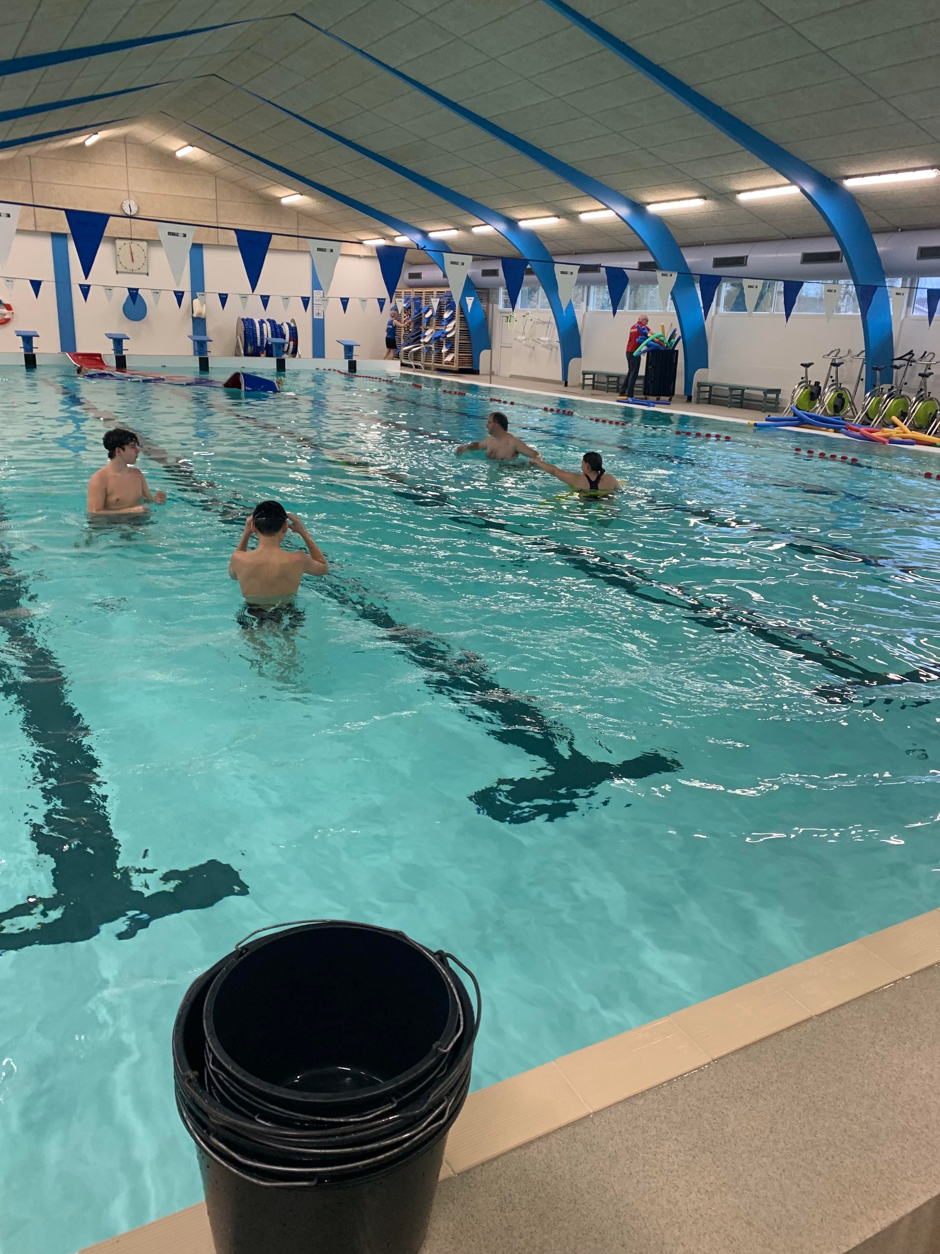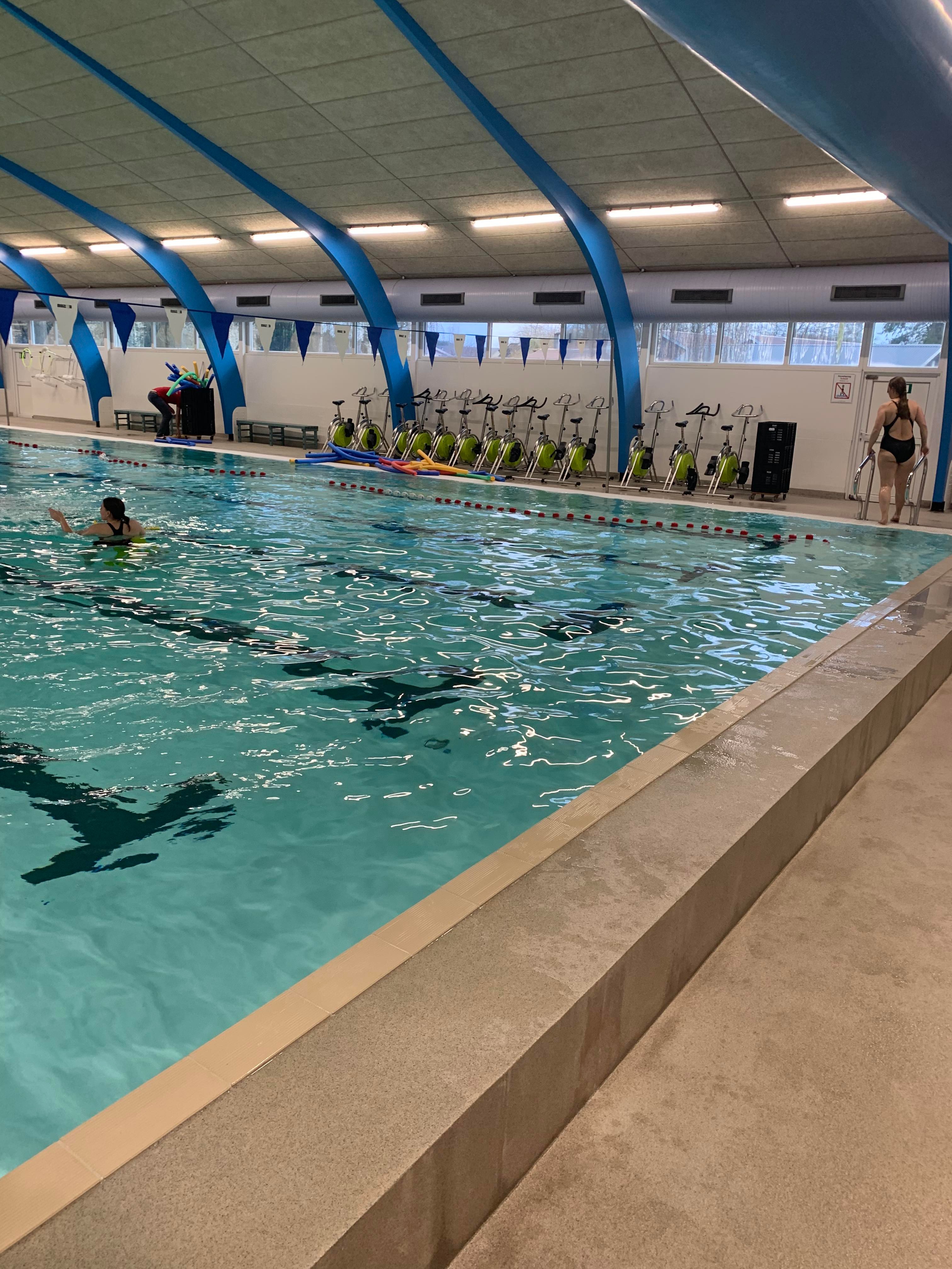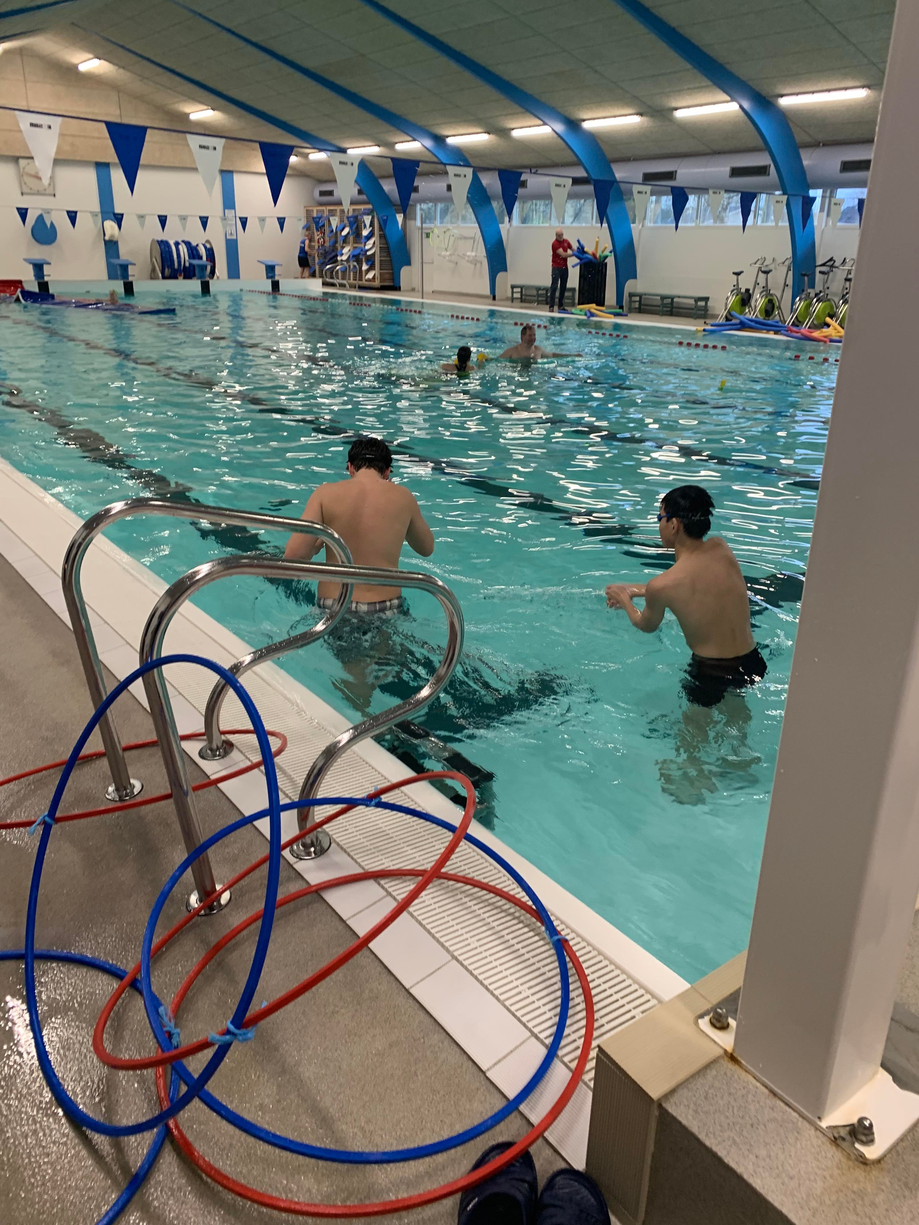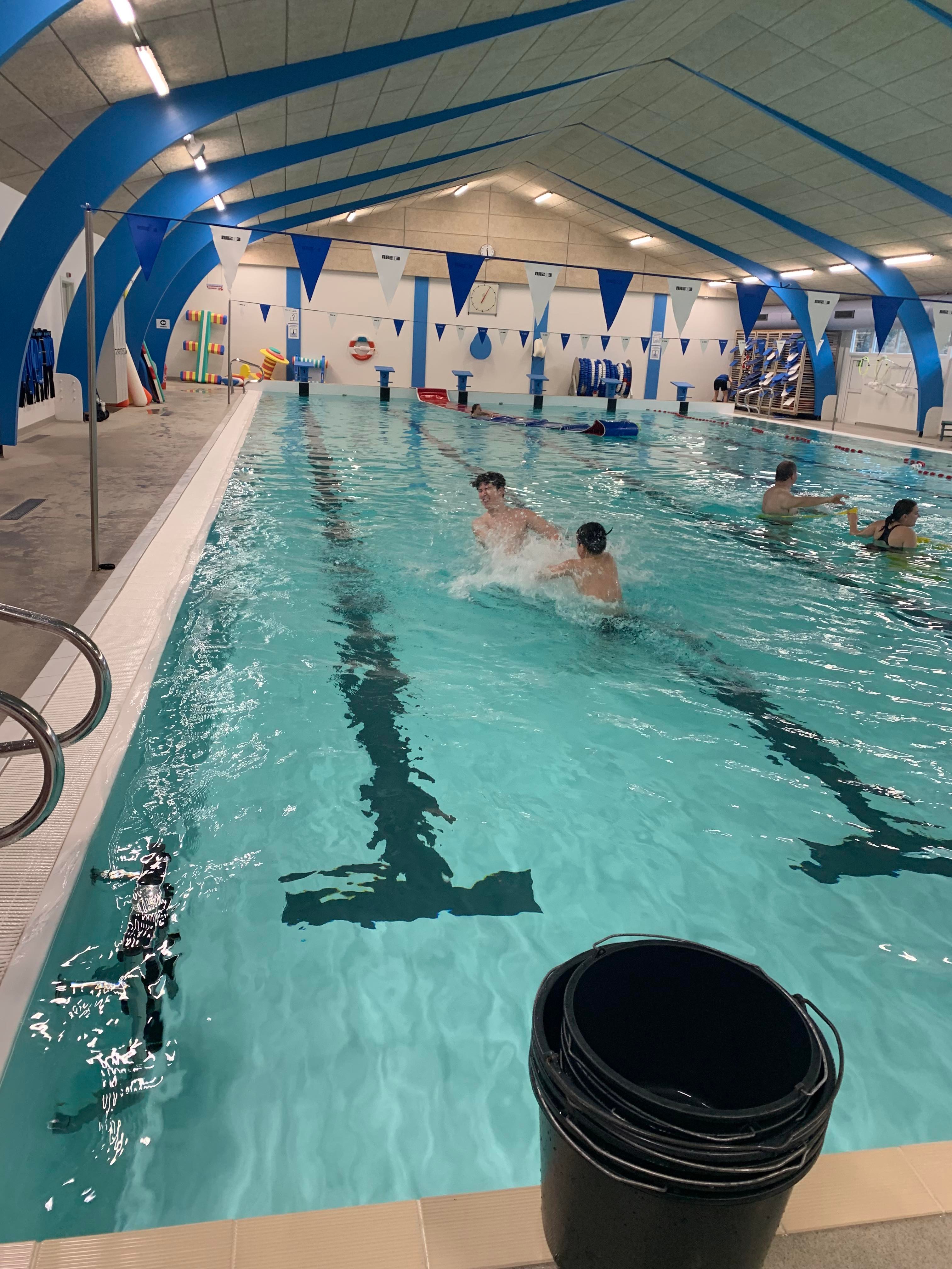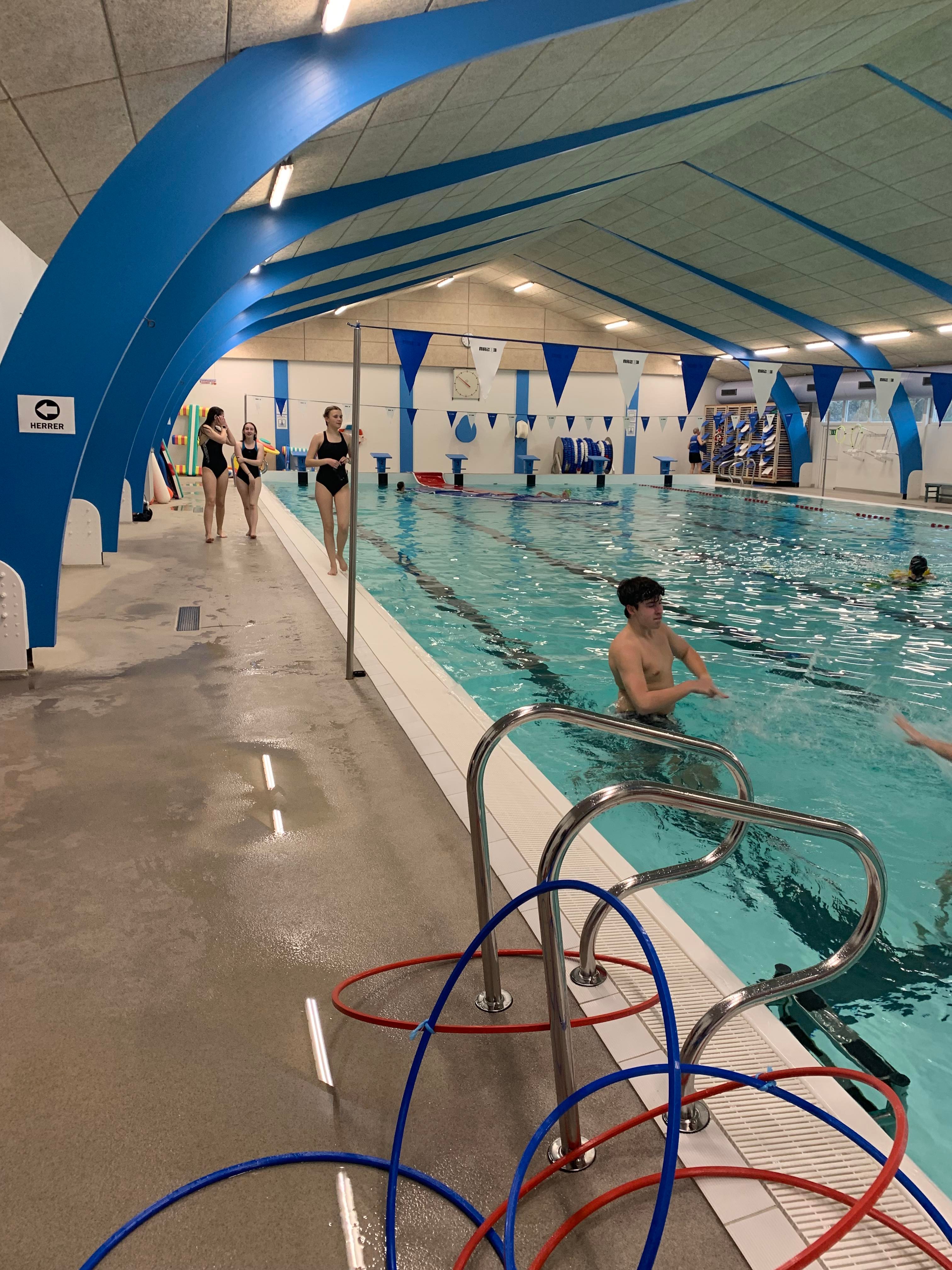 Vi lagde ud med lidt opvarmning i svømmehallen og efterfølgende stod den på gejl og gøgl i bassinet. Inden vi hoppede op, tog vi en tur i det varme vand.